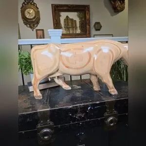 Make a bold statement with this magnificent vintage wooden animal sculpture! This large piece, likely dating from the mid-20th century, features a beautifully carved bull or steer with a sleek, polished finish.
