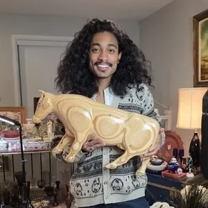 Eyes: The bull features small, striking blue eyes, adding a unique, lifelike touch. It also has small carved horns.