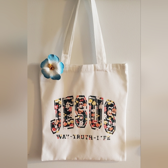 Stylish white canvas tote bag featuring a vibrant floral design.