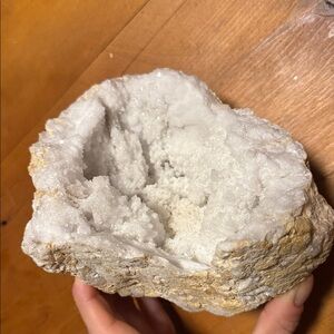 Beautiful large white quartz geode with bright, sparkling crystals and a deep open center. A stunning décor piece that brings a peaceful, uplifting touch to any room. Full of shine and in great condition