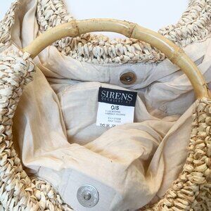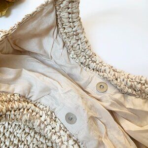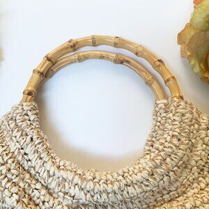 Large Woven Beige and Brown Corn Straw Bag with Round Bamboo Top Handles