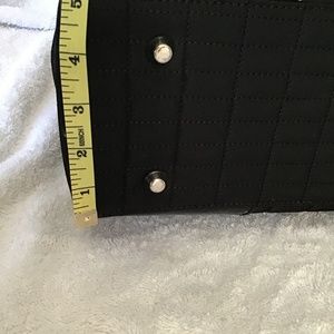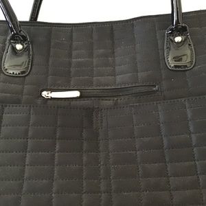 Excellent condition, was used only a couple of times. This quilted bag is large enough to fit a laptop. It has two pockets in front and one in the back. It also has five pockets inside one big in the middle and four smaller on the inner part of the front side. This bag is excellent for travelling or for day to day use. No wear and tear or damage on any part, handles and four corners are patent leather and in perfect condition. There is only one small stain inside. See the last picture.