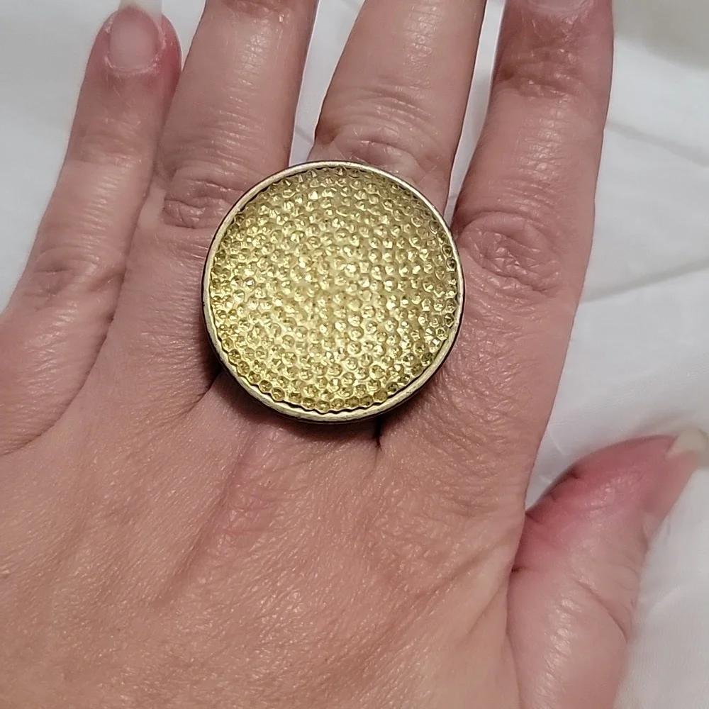Beautiful large, tall circle ring. One large piece with carvings to look like many diamonds. Yellow tint. Band is elastic, adjustable, with some discoloration. size 8