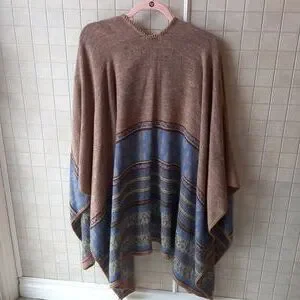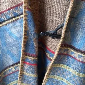 Beautiful, soft wrap that fastens at the front. No tags to indicate what side, material or brand name. Fits like a large, very flowy and you can wrap it with a belt if you want to give it more shape. Sides are longer than the front and back.