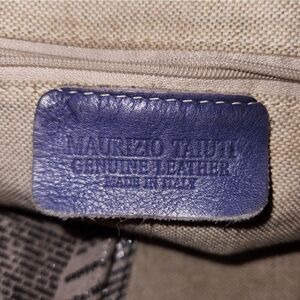 Soft black on cream news print & smokey blue leather tote shoulder bag purse with tan canvas lining, by Maurizio Tauiti.