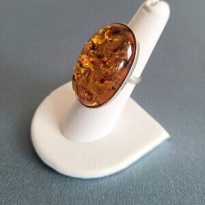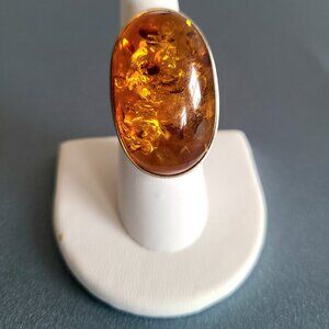 Large oversized sterling silver cocktail ring with oval Amber stone.
