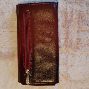 - inside of wallet has 2 zip compartments and 3 pockets, red stitching details
