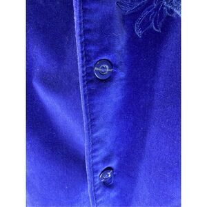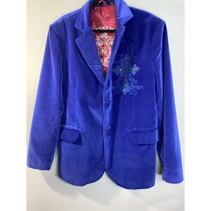 Truly unique velour blazer/jacket in a vibrant blue colour with embroidered cross and stud detail on the front and back as shown in pictures. Two interior pockets. Like new condition.