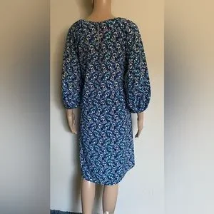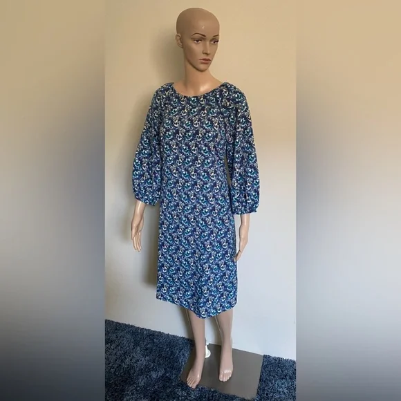 Blue Floral Knee Length Dress with 3/4 Sleeve. Single Back Button Closure. Bodice is Fully Lined.
