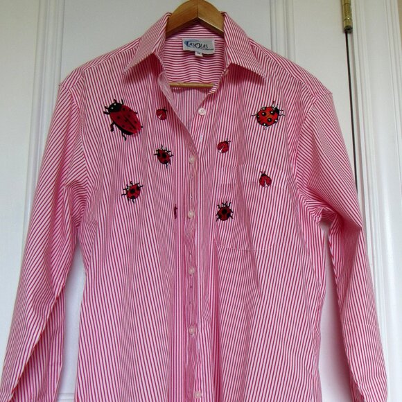 Las Olas Women’s Red White M Shirt Ladybug Embroidery Bling Button Pinstripe