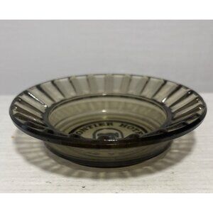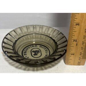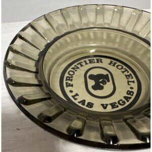This vintage smoky glass ashtray from the iconic Frontier Hotel in Las Vegas offers a piece of history with a ribbed design, ideal for collectors.