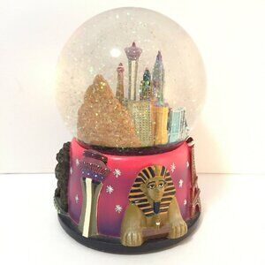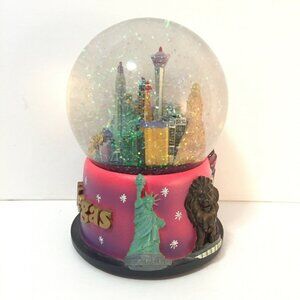 In excellent condition this is a great snow globe. The water level is nice and high so there is minimal space at the top (see photos). It has glitter or sparkles. It is a nicer quality for a souvenir. The music is Luck be a Lady Tonight. It is made of resin and the globe is glass. It measures 5 and a half inches high.