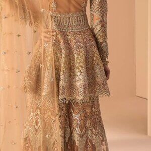 Dusty Peach Embroidered Sharara Suit includes a net top with santoon inner, net bottom with santoon inner, and a net dupatta. Embroidery is present on this style using zari, sequins, and stone work.