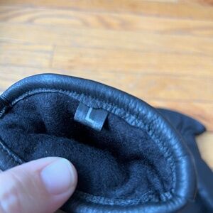 Laska Black Leather Lined Gloves. Adjustable snap at wrist. Excellent condition, I don't believe they were ever used. Tagged as a large, seems to fit a little small.