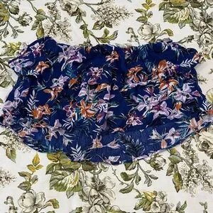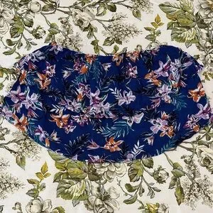 Stylish strapless blue top with vibrant floral design. Perfect for any summery occasion. Top is elasticized to support.