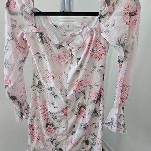 Double layer floral mini dress. Lace front details. Back zip for easy wear