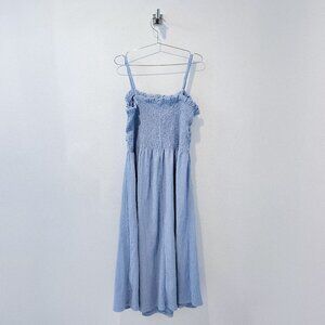 Sleeveless, calf-length dress in crinkled jersey. Narrow, adjustable shoulder straps and fitted, smocked bodice with ruffle trim at upper edge.