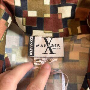 Late 1970s Geometric satin brown green square print button up from XXX manager