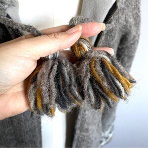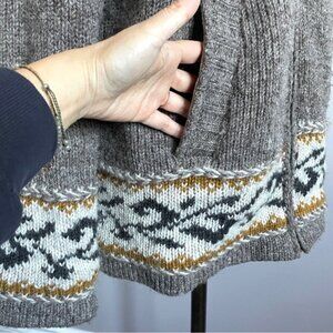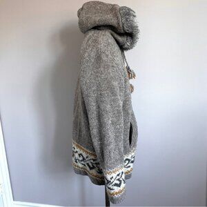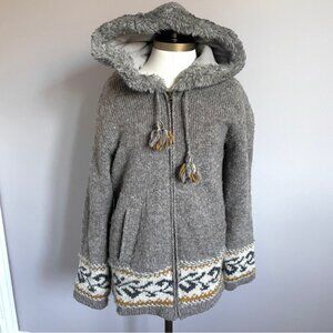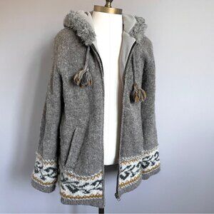 2 patch slip pockets, pompoms at hoodie with faux fur trim, lined in polar fleece, knit exterior is made out 100% wool in Nepal. Designed in Canada! 🇨🇦