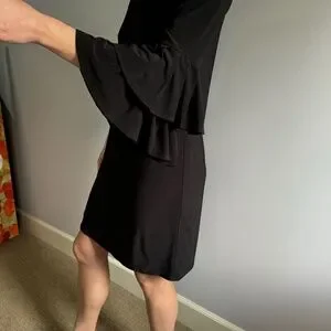 This Laundry Black Ruffle Dress has a scoop neck and ruffle detailing on either sleeve. Lots of stretch in material. Size M. Fits like a 8US.