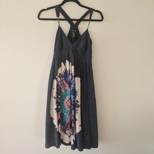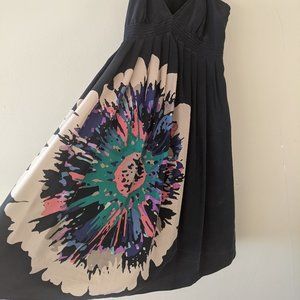 Beautiful 100% silk dress, only worn once for a few hours. Dark charcoal colour (not quite black) with multi-colour floral design. Straps have metal hardware. Hits just above the knee on a person of about 5'5.