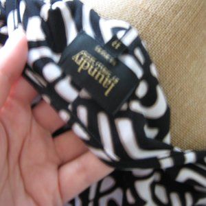 Poly blend stretch material. Off white background with geometric print of black and brown.