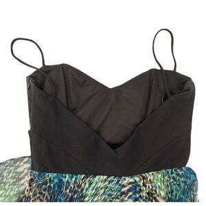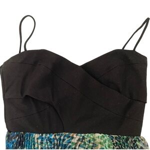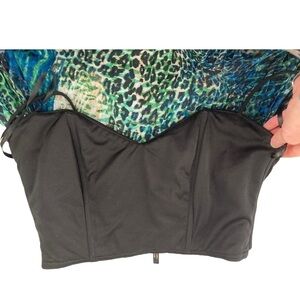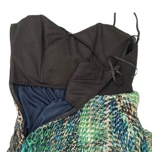 Such a beautiful and unique piece! Long flowy maxi dress with a wrap style bodice and super soft sheer pleated crinkle chiffon texture long skirt. Mix of blue and green watercolor effect design with leopard print - very tropical and bohemian. Length is about 48” from the top of the bodice. Straps are about an extra 5” long. Size 4, bust measures about a 32” band. Wrap style black bodice with boning on the inside. Deep V neckline on the back. Could even be an alternative prom dress!