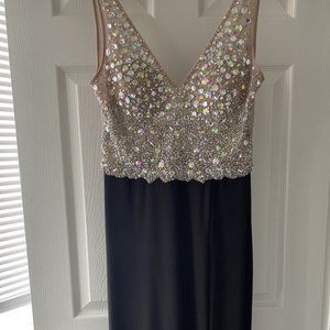 Elegant, sleeveless long dress, beige net top with silver sequins and beads, built-in bra. Deep-V sheer back. Black full length lined skirt with side slit. Matching lightweight beige cover up, mid length sleeves with small sequined detail. Perfect for formal event or wedding, mother of the bride or groom.