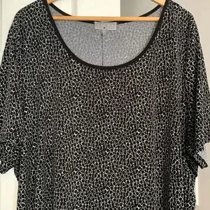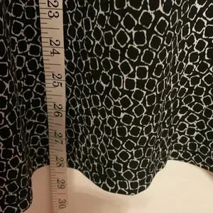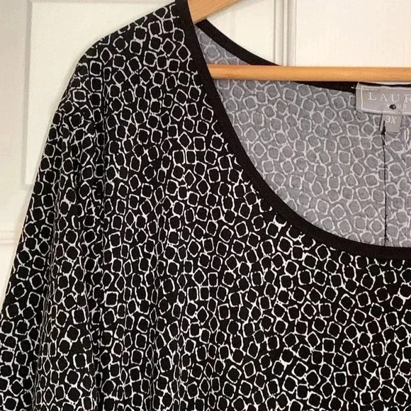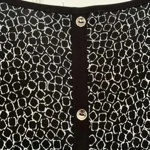 Cool top! Black and white geometric pattern, black trim around neckline. Interesting back of garment has black trim and silver tone buttons. Size 3X. Lightweight and stretch.