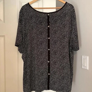Cool top! Black and white geometric pattern, black trim around neckline. Interesting back of garment has black trim and silver tone buttons. Size 3X. Lightweight and stretch.