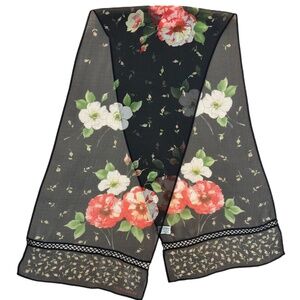 This elegant Laura Ashley scarf features a sheer black silk chiffon base adorned with vibrant red and white blossoms, accented with delicate green leaves and scattered rosebuds. A refined lace-trim border adds a touch of femininity and detail, making this scarf versatile for both casual and dressy looks. Laura Ashley is well known for its timeless floral prints and quality craftsmanship, making this scarf a charming addition to any collection.