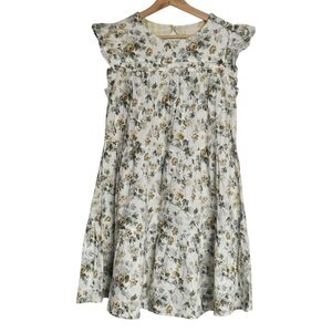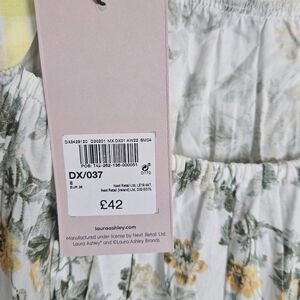 The dress features a off-white background with a pattern of small yellow and grey flowers and green foliage, in addition to plaid accents. It has a round neckline, ruffled cap sleeves, and a tiered skirt. It's made of 100% cotton that makes it suitable for spring or summer. The style aligns with Laura Ashley's classic aesthetic, which often incorporates vintage-inspired floral designs.
