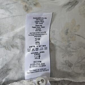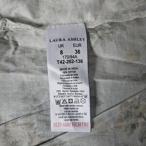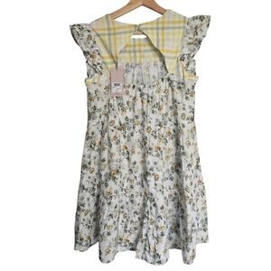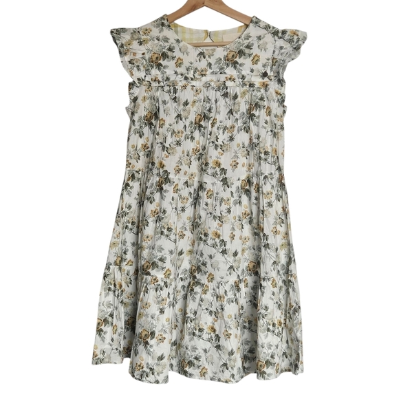 The dress features a off-white background with a pattern of small yellow and grey flowers and green foliage, in addition to plaid accents. It has a round neckline, ruffled cap sleeves, and a tiered skirt. It's made of 100% cotton that makes it suitable for spring or summer. The style aligns with Laura Ashley's classic aesthetic, which often incorporates vintage-inspired floral designs.