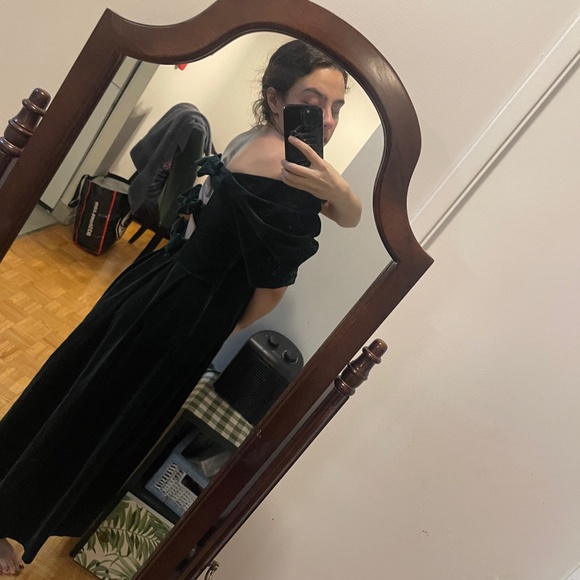 Laura Ashley green/black velvet dress 🤍 Soft velvet with a romantic, vintage-inspired silhouette. Features an elegant off-the-shoulder neckline and statement bow detailing at the back. Fully lined and drapes beautifully on the body. Perfect for winter events, evening wear, or a timeless holiday look. Excellent condition. Size 12 - L