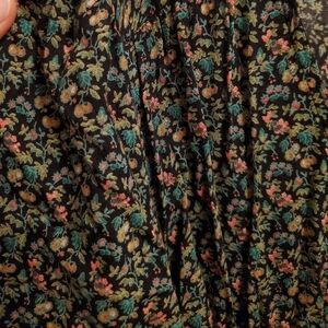Laura Ashley floral dress. V neck. 3/4 sleeves. Black, green, pink. Size 6, see pictures for measurements. Buttons at the front. Zipper on the left side. Black lining inside. Dress is around 42" long. Slightly opened at the bottom as seen on pictures. Adjustable cord at waist. Elastic at the end of each sleeve. Excellent condition. No stain, no rip. Non smoking house.