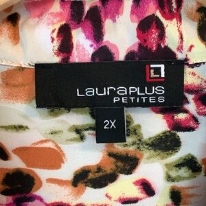 Size 2X. Vibrant multicolor blouse with a stylish pattern. Features shades of pink, orange, and green. Mandarin V neck collar and button front. Long sleeves, button in cuffs. Lightweight and smooth fabric. Love this blouse.