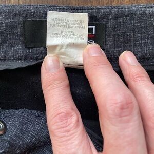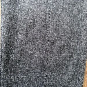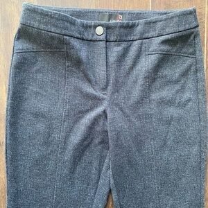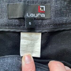 Laura dark gray slim leg pants in size 6. Features include front and back pleats, a zip fly with button closure, and two vertical front pockets. The fabric has some stretch. There is some pilling in the fabric; please see pictures for details.