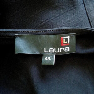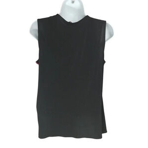 Unique, sleeveless draped top. Two connected layers. Inner one is bright and colourful, and connected to the inner arm pit beneath the black layer. The outer cross layer comes from the shoulder and drapes across connecting to the hip seam. Great top on its own or under a blazer.