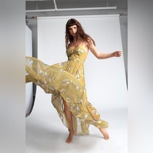 Like new no signs of obvious wear. This dress is absolutely beautiful and feminine and flowy! Beautiful floral print and chartreuse colour that is very flattering. This was a SS2019 dress from Laura Garcia and was featured in Vogue! Hits around the ankles! 100% silk on top - Poly inside