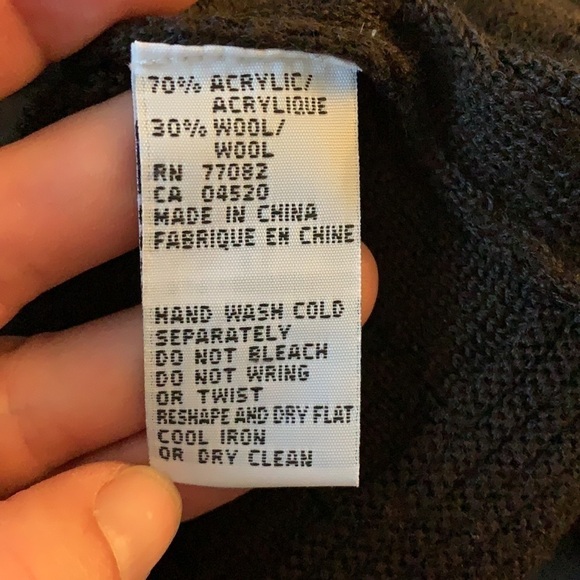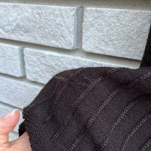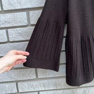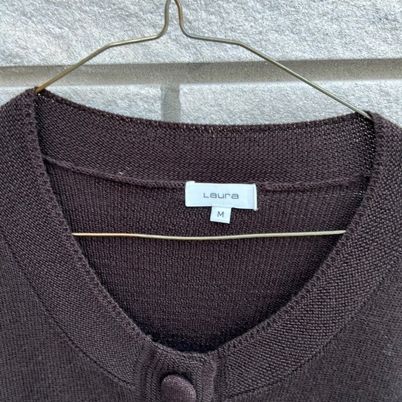 Knit cardigan from Laura. Dark brown in colour, has a shimmer-type thread in the fabric, adding a very subtle shimmer to the sweater. There covered buttons down front of cardigan. 3/4 length sleeves with a slight bell shape.