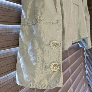 Note: top button is loose, tiny marks on left sleeve (see pic), fabric has curled at pockets (steaming would remedy this)