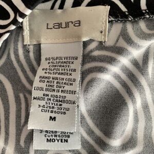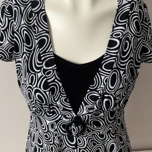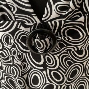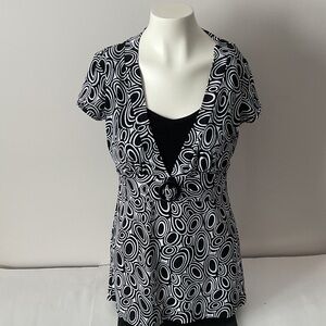 All over black and white print V-neck front with accent camisole Buckle accent on front short sleeves Pit to pit 18 inches