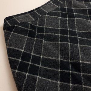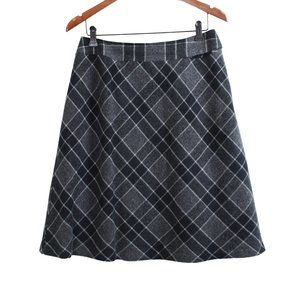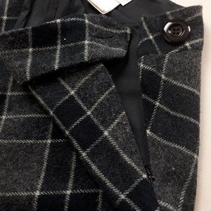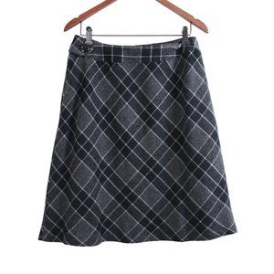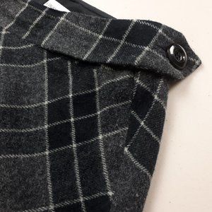 Always in style, a classic mini skirt with large cross plaid in a grey hue. This timeless style has a straight waistband, side zipper and tab button closure. It’s designed in an A-line cut and is fully lined. Perfect for fall, winter and spring. Great condition.
