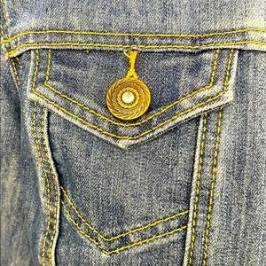 Note: There is a missing button top on the right side on the waist area. Please see picture. This jacket is in very good condition except for the missing top of the button.