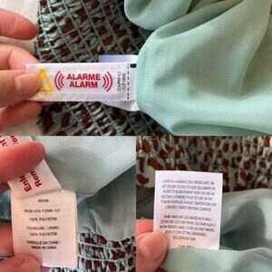 Cute teal blouse with short flutter sleeves & allover cheetah print complimented by subtle gold metallic thread. Tie detail at neckline & elastic waist with shearing.