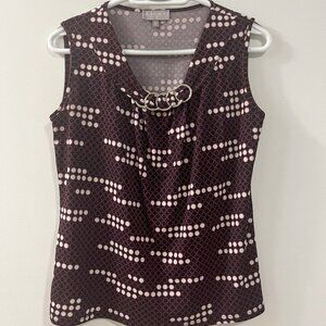 A sleeveless patterned blouse featuring interlocking metal rings at the neckline. Very good used condition.