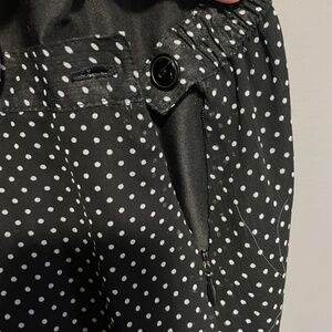This asymmetrical polkadot skirt is lined and has multi-tiered ruffles. With a waist band with a bit of stretch and a zipper and button closure, this skirt fits comfortably yet snugly with no gaping.