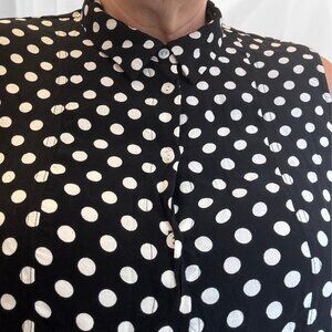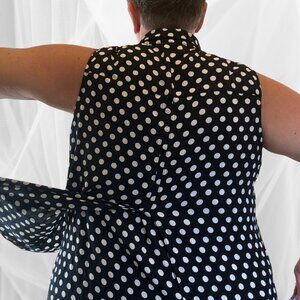 This classic black-and-white polka dot blouse from Laura Plus is a timeless wardrobe staple. Featuring a collared neckline and a full button-front design, this sleeveless top is both chic and breathable, perfect for layering under a blazer or wearing on its own during warmer days. There is an extra draping of fabric on the front and back that gives this shirt great movement. The fabric has a soft, lightweight drape that flatters curves while keeping you cool and comfortable.