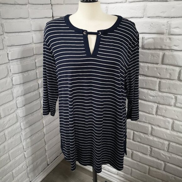 Laura Plus Ladies Size 1X Navy & White Striped V-neck 3/4 Sleeves Tunic Top