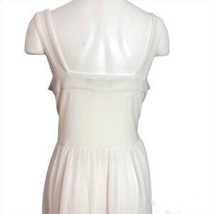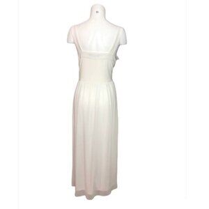 Pre owned. Gorgeous dress. Ruffles covering the bodice of the dress. Ankle length dress. Chiffon overlay. This is such a pretty dress for any special occasion. Small wedding, bridal shower, wedding renewal of vows, prom etc. Fabric: Polyester and spandex.